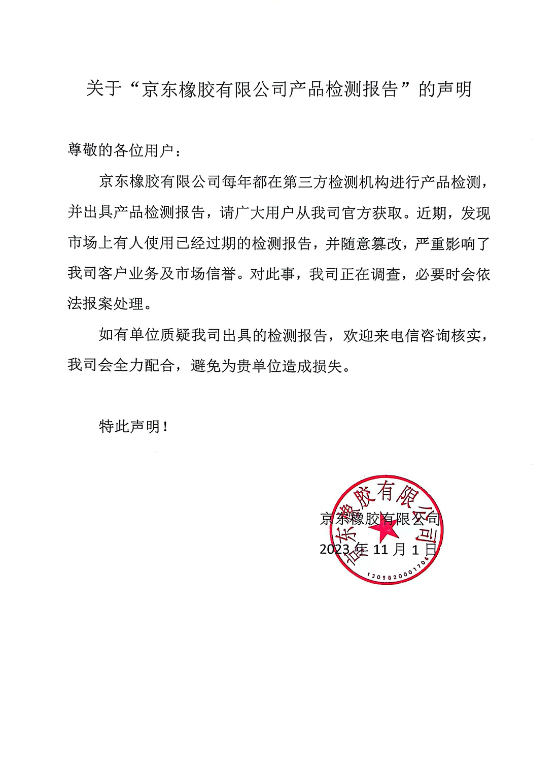 關(guān)于“京東橡膠有限公司產(chǎn)品檢測(cè)報(bào)告”聲明
